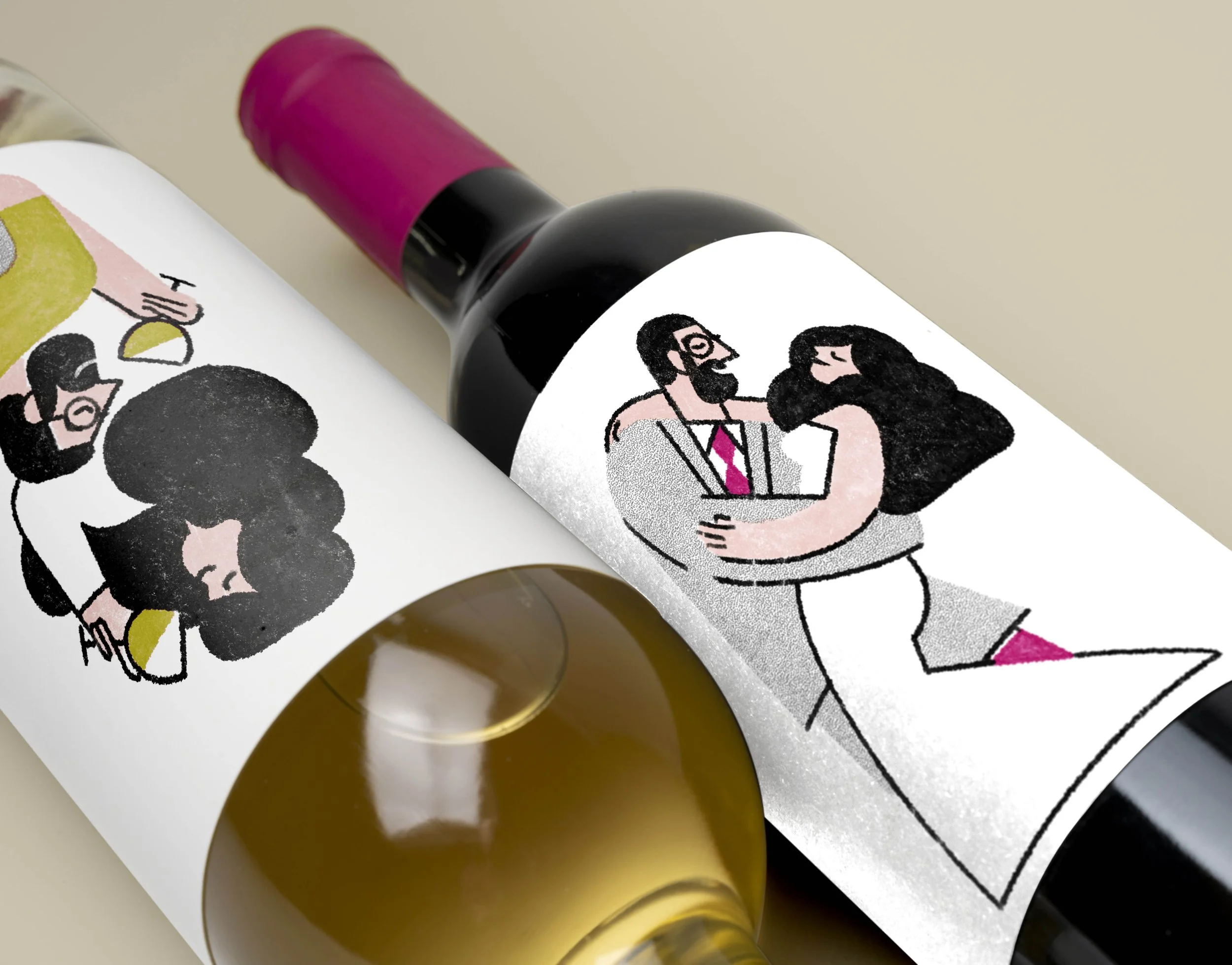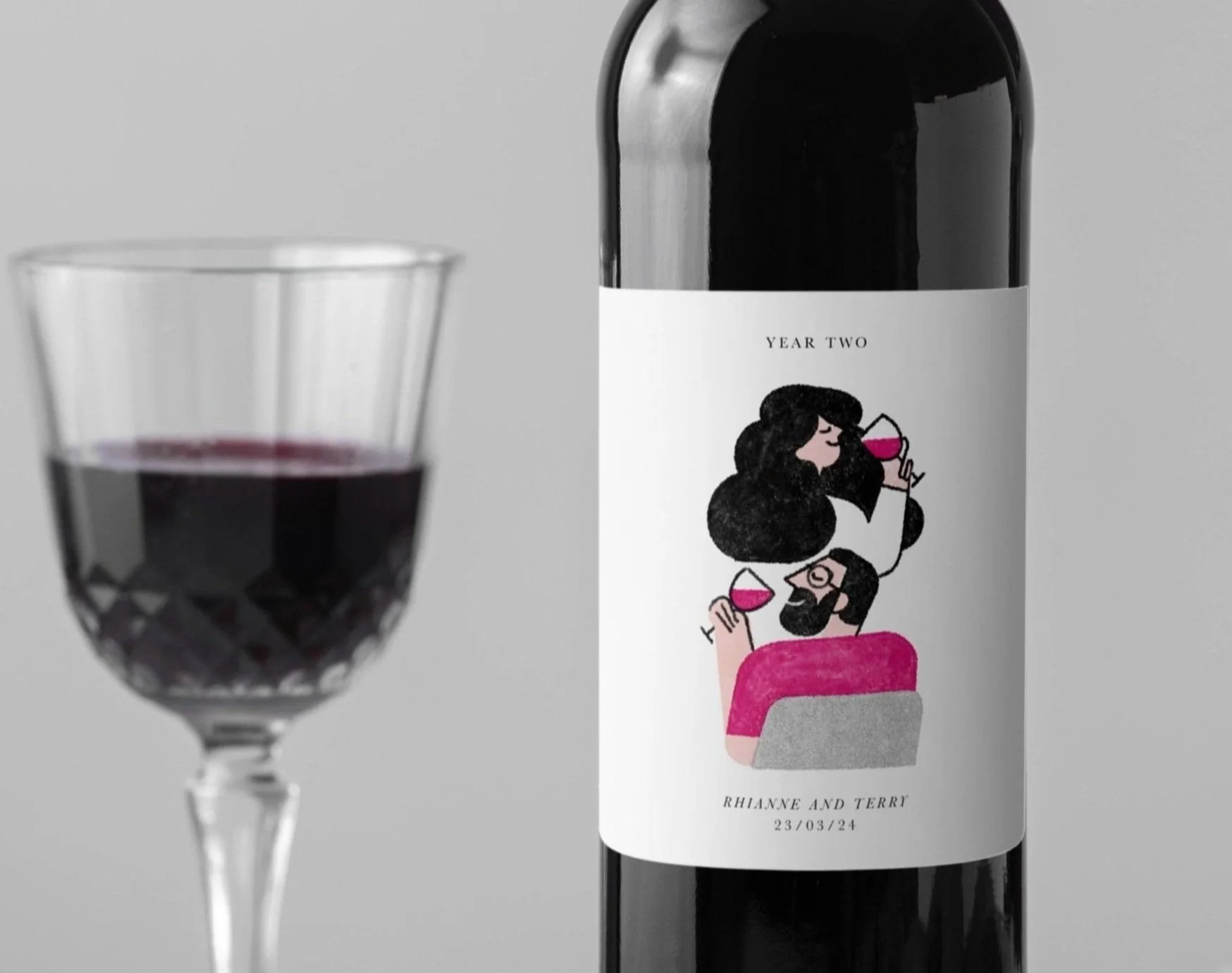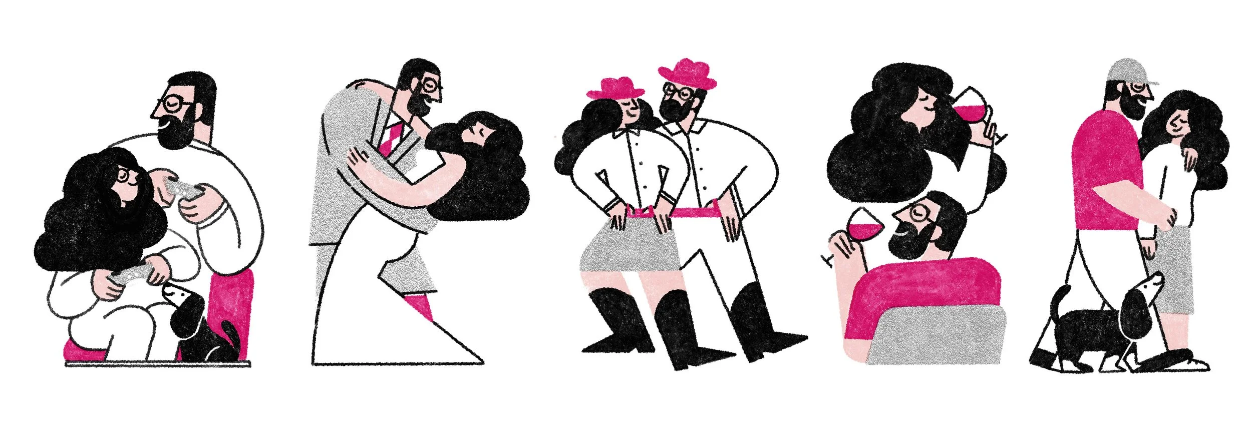 For a friend’s wedding, I illustrated 5 wine labels for the couple to celebrate on their subsequent anniversaries. The illustartions depict the couple doing their favourite things: dancing, dog-walking, gaming & dining.
